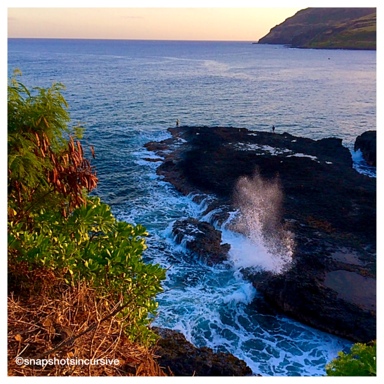 Standing on the edge of a cliff overlooking the crashing waves below can be both invigorating and terrifying. Simply because every choice we make involves risk and consequences. Never mind that gingerly stepping along a steep narrow path, riddled with fragments of lava slivers crumbling without warning, keeps the adrenaline pumping. It’s all about the destination, right? Or is it? After all, from this vantage point the view of the faraway lighthouse emerges from obscurity. It comes clearly into focus. So does the gigantic cruise ship on its way out to sea. Besides that, the two hard-working fishermen below, with their rods cast out and their buckets half full, make this same trek everyday like clockwork to come back with the best catch-of-the-day. All is calm except for the rush of water against boulders. The sight alone is mesmerizing. Waves rushing in, tide pulling out resembling an aggressive tug of war. Land versus Sea. At times the ocean almost creates a water spout sending salty jet sprays upward to form a gusher, or powerful water fountain. Giant waves frothing the base of lava rock leave a foam behind resembling egg whites whipped into a meringue.