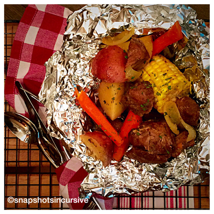 What’s Cooking in Gail’s Kitchen? Home Cooking featuring a Happy Hobo Picnic! The best thing about this recipe is ANY combination of meat and vegetables can be used! No more picky eaters. Everyone chooses the vegetables they favor that appeal to their personal taste buds. And clean-up is a snap leaving more time for outdoor fun!