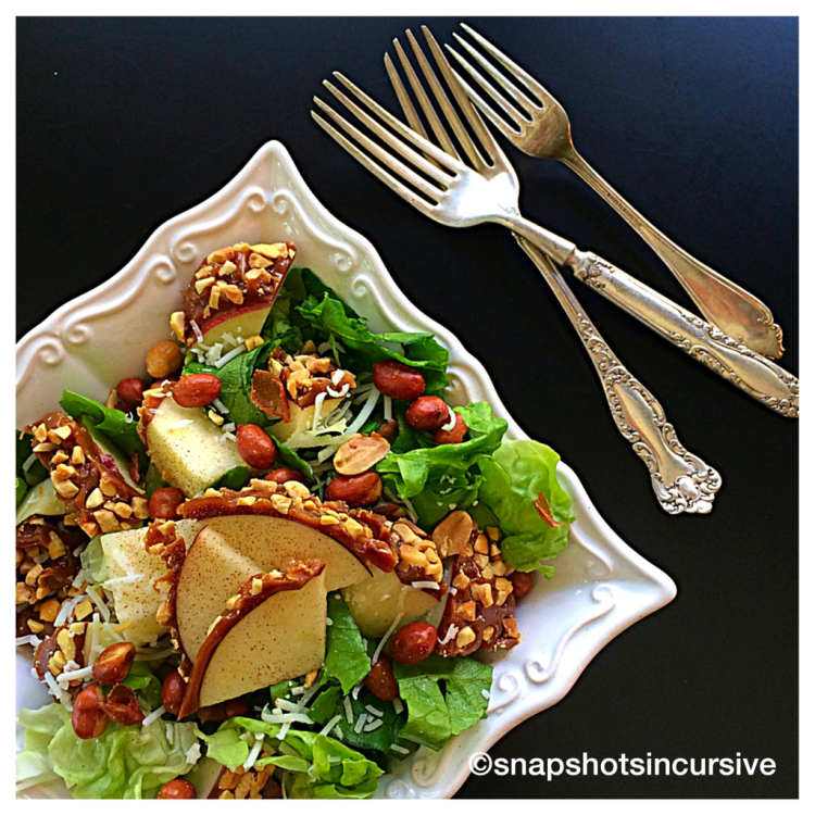 What’s Cooking in Gail’s Kitchen? The Joy of Eating: Taffy Apple Salad! Wait a minute….is this allowed?! I can’t resist a sweet caramel apple this time of year. Or two. So to balance the blend of flavors ranging from sweet to tart to salty, I threw in some healthy greens, cheese, and cinnamon. Make sense? The old fashioned taste of ooey-chewy caramel turns an ordinary salad into an autumn festival. Join the party.