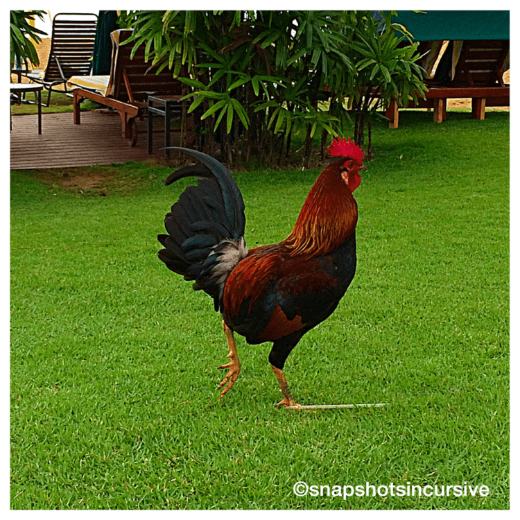A speckled rooster crowed as he strutted around the beach chairs with head held high acting as though he were “King of the Island” and we were all expected to clap our hands in applause at being in the mere presence of him. Slowly and methodically a hunchback wiry old man with a weather-beaten brow sauntered toward the cedar shelter, his gait slow, wearing nautical swim trunks. A full-face snorkeling mask was dangling loosely around his neck. Each step reminded him of how he had taken his vitality and physical strength for granted only a few years ago. The crashing waves of high tide seemed more of a challenge this morning than he initially thought.