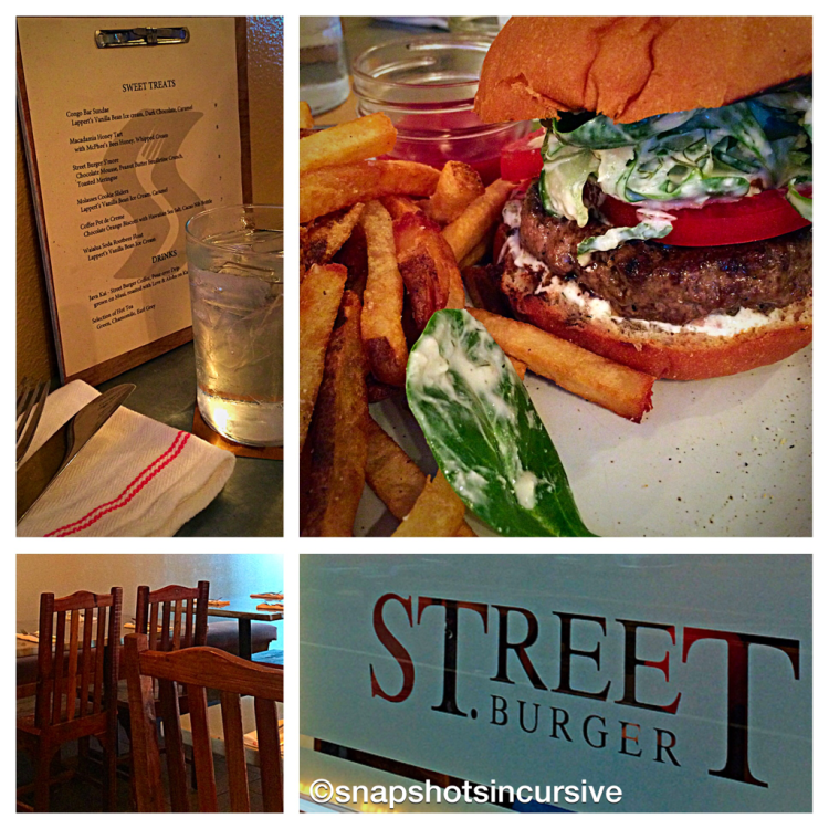 Dining Outside the Home: Street Burger in Wailua, Kauai! An urban upscale burger joint? When you add a gourmet chef who gives you a front row seat to his Argentinian-style grill and a pastry chef with a view of the kitchen, it adds up to years of experience serving the public with flare. The menu boasts 20 different kinds of burgers, made from good, natural ingredients. Even the condiments are made from scratch. The high-ceiling décor is industrial chic. In a sweeping glance, you’ll find everything from ship lap and tile to stainless and hardwoods reflected in the surroundings. Through glass-paneled sliding barn doors, a view of the Sleeping Giant mountain range forms a backdrop for inside seating. The enticing aromas encourage you to relax and stay awhile. Put down the cell phones and soak up the rustic ambience. When the feta-spinach-cucumber stuffed Greek burger arrived, with a flip of the oversized striped napkin across my lap, I was ready to dig in.