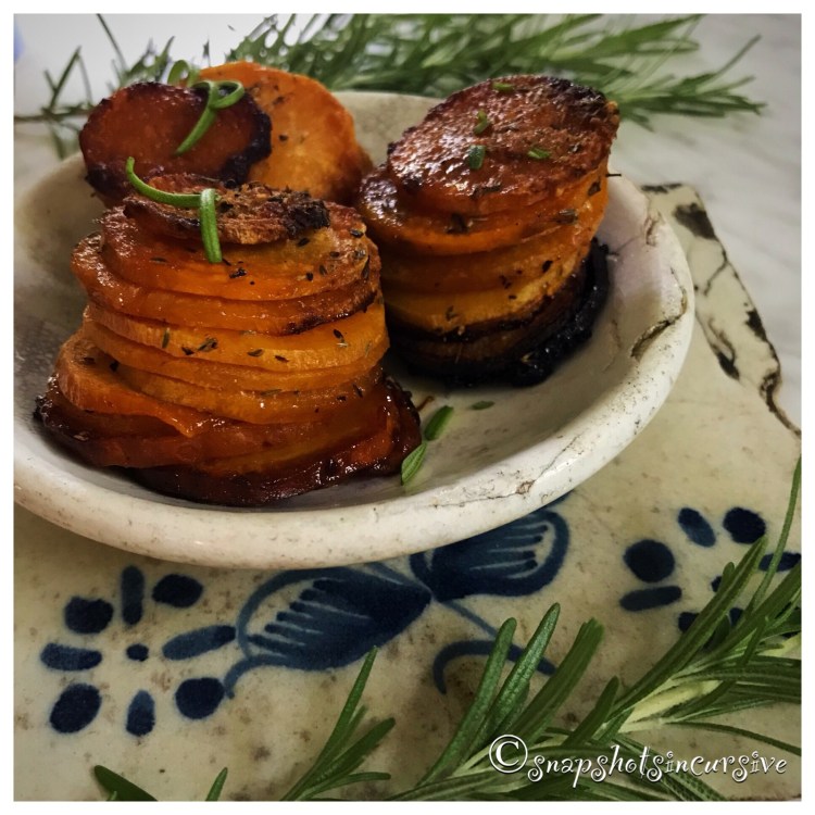 What’s Cooking in Gail’s Kitchen? Equal Measures: Sweet Potato Stacks! Bring gourmet taste, with a quirk of presentation, to the dinner table tonight. It’s not rocket science. In fact, you may find yourself giggling at how ridiculously simple this is to make. When I pierced each stack with a rosemary sprig, my husband nearly fell out of his chair in amusement. (It’s not at all necessary. The sweet potato stacks stand upright on their own.) Roasted in a muffin tin, and drizzled with pure maple syrup are two trade secrets you can share with others. Or keep to yourself. Either way, it’s a tower of Yum.