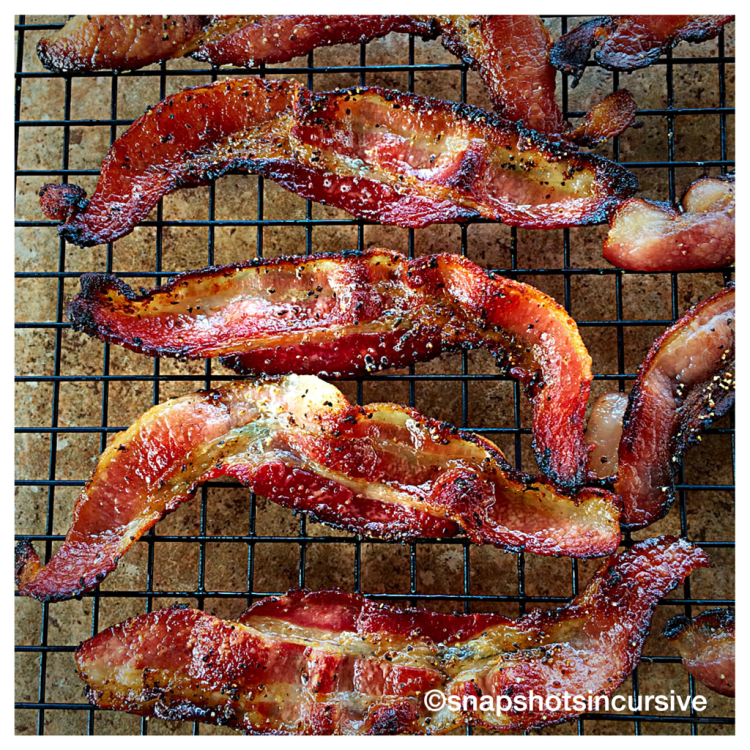 Preheat oven to 350°. Place bacon strips on a baking sheet lined with a wire rack. Sprinkle black pepper over all. Bake 40-45 minutes or until crisp. Carefully remove pan from oven, being careful not to spill the hot liquid. Drain bacon on paper towels. Serve warm.