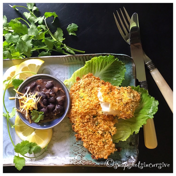 What’s Cooking in Gail’s Kitchen? The Next Step: Tortilla-Crusted Tilapia! I never thought of tilapia as an interesting choice of fish until I mixed things up with a Santa Fe style coating. The robust crunch of tortilla chips is a surprising prelude to the tender moist fish inside. It had me wishing I prepared seconds for the hubs and me. If you’re looking for a meatless meal, give it a whirl. Who knows, you may find yourself adding tilapia to the weekly menu.