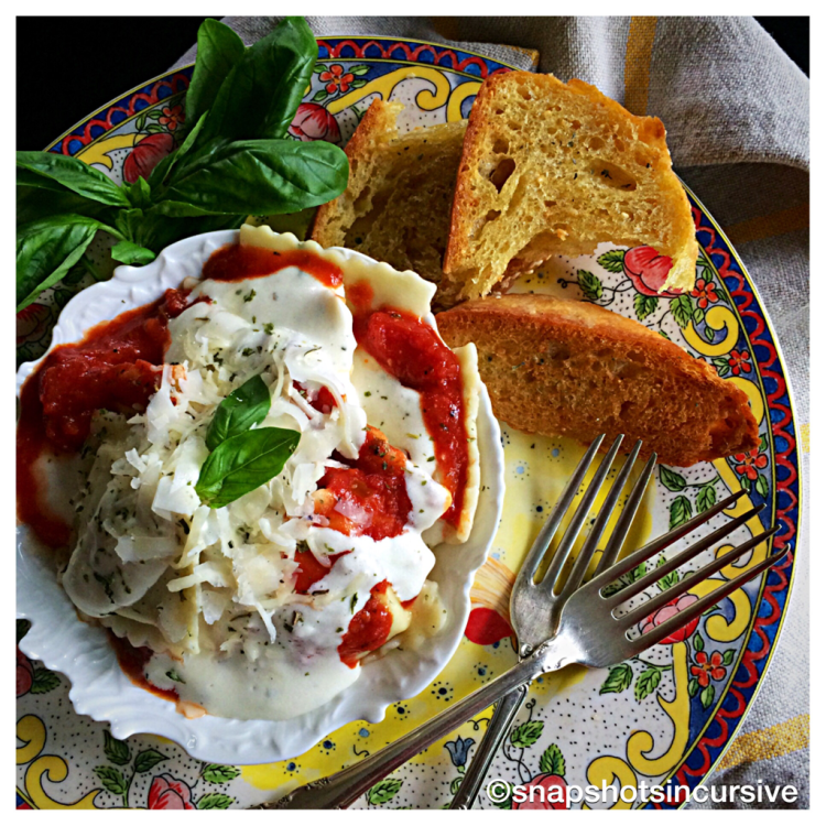 What’s Cooking in Gail’s Kitchen? Eat More: Quattro Formaggio Ravioli! Four different cheeses in one dish make me think I died and went to Heaven. Or at the very least, I did something right. Let me share with you a little secret. It doesn’t matter that you use store-bought ravioli because it’s the cheese sauce you practically slurp with a spoon!