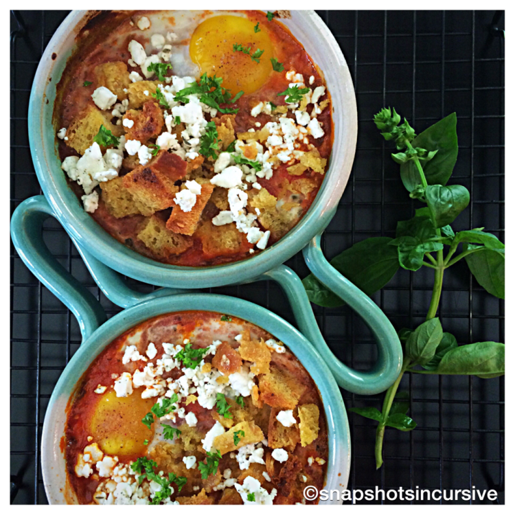 What’s Cooking in Gail’s Kitchen? Eat More: Tomato Feta Egg Au Gratin! I’m all for trying new things, so when I saw this recipe featured at Williams-Sonoma, I knew it had to be good. The fact that I already had all the ingredients on hand was sheer bliss. I confess, I may have tweaked the original by adding a buttery crouton topping, but that’s just me. You may do without. As everything warms together in the oven, the aroma arising is staggering. How much longer? There’s something about serving individual casseroles that make a dish eloquent, wouldn’t you agree?