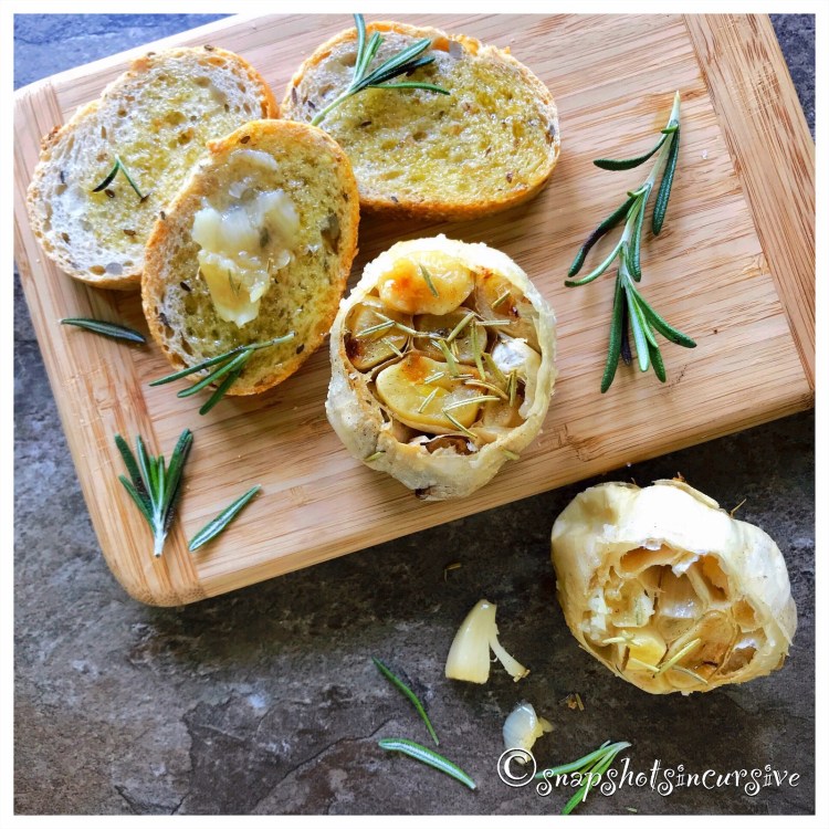 What’s Cooking in Gail’s Kitchen? Table Food: Garlic Bulbs Roasted! Do you like the smell of garlic? Do you find it sweet, alluring, pleasant, pungent, or exciting? If garlic is your friend, get ready for a road trip you will long remember. Roasted garlic cloves could make you feel extra special. Especially slathered across a slice of crusty artisan bread. When garlic bulbs are slow-roasted in the oven, they become soft, caramelized, and almost sweet. The tantalizing aroma will practically drive you crazy. As you wait with anticipation, don’t be surprised if you find your mouth watering just a bit. Be patient. Once done, the tender golden cloves collapse and spread like butter. It is definitely worth the time spent in expectation.