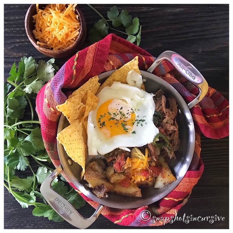 What’s Cooking in Gail’s Kitchen? The Clean Plate Club: Huevos Rancheros! The nice thing about a breakfast like this is it’s basically made from leftovers. Beef roast. Check. Baked potatoes. Check, check. If you need ingredients on short notice, no worries. Substitute cooked chicken instead. Potatoes with the skin on cook very quickly in the microwave before being transformed into tasty hash browns. Just remember to pierce them first. Then cook on High for 5 minutes each. For this morning’s heuvos rancheros, I skipped the tortillas and substituted a couple of corn chips for crunch. It’s all good.