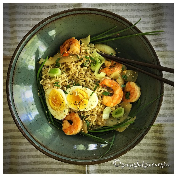 What’s Cooking in Gail’s Kitchen? Equal Measures: Ramen Noodle Shrimp and Egg! So often, in college, a regular diet may consist of ramen noodles in lieu of the standardized meal plan. I remember buying ramen noodles by the case for my son during his freshman and sophomore years. Sure, it stretches the budget for other essentials, but in the long run if you can ditch the salt-laden seasoning packet and add a few veggies, it’ll hike the nutritional value with a burst of flavor as well. Try sautéed shrimp and leeks. (Frozen vegetables are also a cheap option because a little goes a long way.) Add red pepper flakes for spice and toasted sesame seeds for crunch. It transforms the dish into a main course meal.
