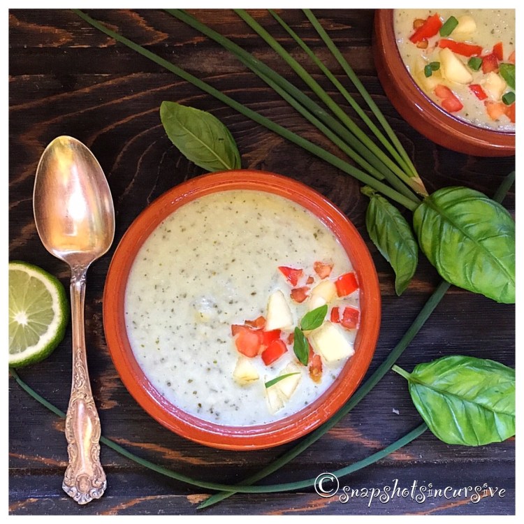 What’s Cooking in Gail’s Kitchen? Fab Foodstuff: Yesterday’s Cucumber Soup. Here we go again with another cold soup option. It may sound like an oxymoron, but actually if I called it a Cucumber Smoothie, would you drink it? Perhaps. Tell me this, how many times have you been served ice water with a cucumber slice in it? Or grabbed a hydrating plant-based juice beverage at the corner convenience store? Get the picture. It’s all about the perspective. If you find it challenging to eat cold soup, or just plain WRONG…by all means, pour it into a glass and slurp away. To quote William Shakespeare, “A rose by any other name would smell as sweet.” Carry on.