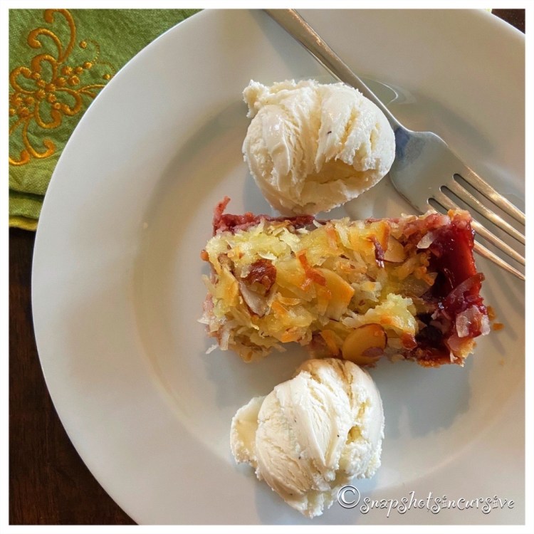 Eating My Way Through the Holidays. Festive Food Gifts: Quasi Cherry Almond Macaroon Slab Pie! Now that’s a mouthful. But truth-be-told when you’re talking about a dessert with mounds of plump cherry clusters, flaked coconut, and sliced nuts…well, nothing else will do. By transforming it all into a slab pie, portions become more manageable over traditional sliced servings. The crust is still flaky, even if there is less of it. Focus instead on a sweet treat with a single shot of Italian espresso or scoop of ice cream. It’s a perfect balance for the taste buds.