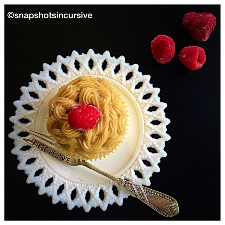 Cream the peanut butter and butter until smooth in a mixing bowl. Gradually add the powdered sugar alternating with the milk. Blend in the vanilla extract until smooth. Frost the cooled cupcakes and top with a fresh raspberry.