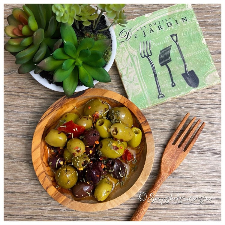 What’s Cooking in Gail’s Kitchen? Test Kitchen Favorites: Red Pepper Spicy Olives! Here’s a little addition to your charcuterie board. Not everyone is a fan of olives, so by placing them in a decorative bowl, such as olive wood, it draws the eye away from everything which entertains the mind that a taste could be a possibility. (You never know, if you don’t try it.) Scoop a little onto a slice of crusty artisan bread, for starters. Then proceed to elevate the combo with a creamy burrata cheese. That tiny tickle at the back of your throat is the kick of pepper. Now you’re getting the picture.