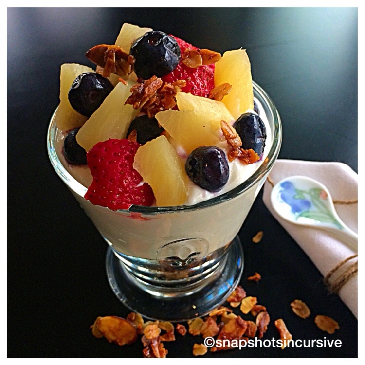 What’s Cooking in Gail’s Kitchen? Appetizers to Desserts: Ina Garten’s Fruit Crunch Sundae! The Barefoot Contessa is a familiar face on the Food Network these days. Not only does she offer great ideas for any meal, but she makes them seem incredibly simple. Today’s recipe comes from a recent episode where Ina wanted to serve up a special breakfast for her husband. I like the idea of taking everyday food and turning it into something extraordinary. By baking a batch of crunchy granola and storing it in an airtight container, single servings can be assembled in a flash. Use whatever fruit is on hand to make it unique.