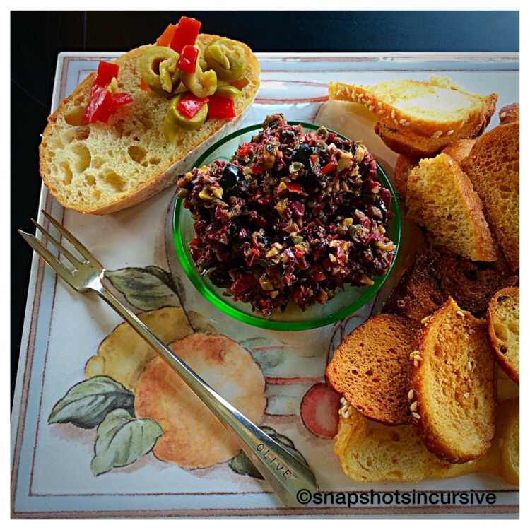 What’s cooking in Gail’s Kitchen? Appetizers to Desserts: Olive Tapenade! Here’s a nice prelude to an evening meal. Forego the usual focaccia bread and herbed olive oil for a southern France hors d’oeuvre instead. By using an exotic mixture of olives and spices, it creates a versatile condiment for crackers, bread, cheese, and vegetables. Later on, serve it over pasta or fish as another option. Whatever you choose, seek adventure. You won’t be disappointed in the mellow salty garlic flavor lingering long into the night.