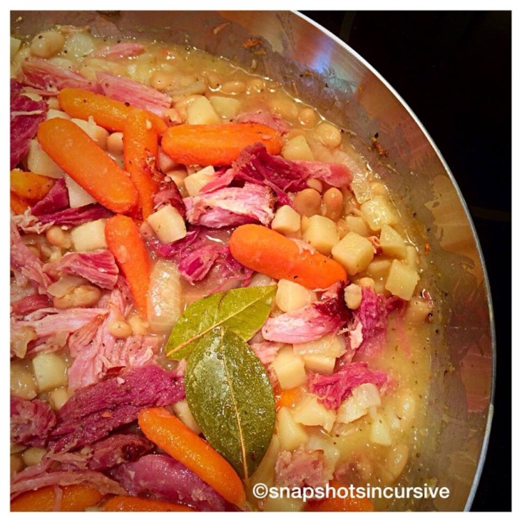In a large deep skillet, heat olive oil on medium-high heat. Sauté chopped onions in seasoned salt and pepper until they turn opaque. Reduce heat to medium. Add beans, ham, carrots, and potatoes. Stir to combine thoroughly. Add bay leaves and celery seed.  Cover and reduce to simmer for 15 minutes. Remove lid and simmer longer for thicker results. Before serving remove bay leaves.