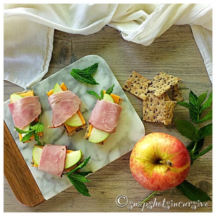 Brush the sliced apples with lemon juice to prevent browning. Cut the ham slices in half. Take one apple slice and place it on top of a piece of cheddar cheese. Wrap them with one piece of ham, seam side down. Tuck a sprig of fresh mint into the snack. Enjoy!