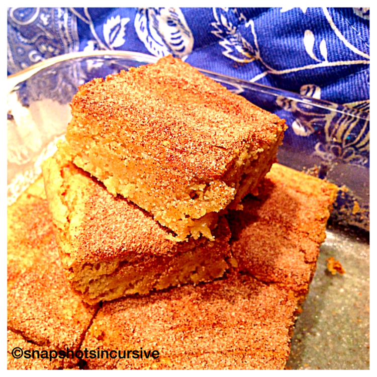 What’s Cooking in Gail’s Kitchen? Simple Sensations: Snickerdoodle Blondies! Mention the word “cinnamon” and automatically people have visions of pastry shops and bakeries emitting delectable aromas that seduce the mind and tempt the body with Happy Day dance moves. And who doesn’t like to say “Snickerdoodle”? Bake-and-Go with this all-time favorite recipe.