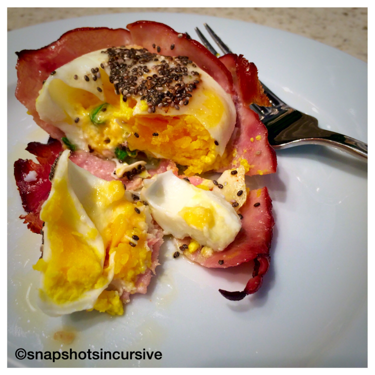 What’s Cooking in Gail’s Kitchen? Simple Sensations: Egg Cup Jambon! What’s black and white and crunchy to the taste? It’s the dense little chia seed. This highly nutritional nut is a member of the mint family boasting fiber, antioxidants, and even iron. Sprinkle it on everything from popcorn to yogurt. Today I topped off the Egg Cup Jambon for a nice chewy finish.