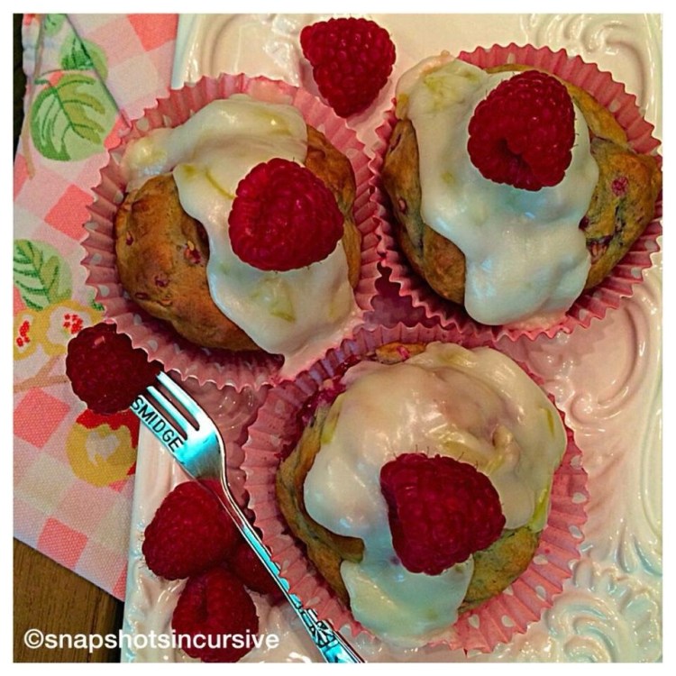 Preheat oven to 400°. Spray the muffin tin with a nonstick oil. Combine flour, baking powder, baking soda, and salt in a large mixing bowl. Set aside. Using a food processor, combine lemon zest strips and sugar. Pulse to finely chop the zest into the sugar. Add yogurt, milk, butter, egg, and extracts. Pulse until blended. Mix the yogurt mixture into the flour mixture and fold until almost blended. Gently fold in raspberries. Divide the batter into the muffin cups. Bake the muffins 18 to 25 minutes, until the tops are golden brown. Remove from oven and let cool in the pan for five minutes before covering with glaze. Serve warm.