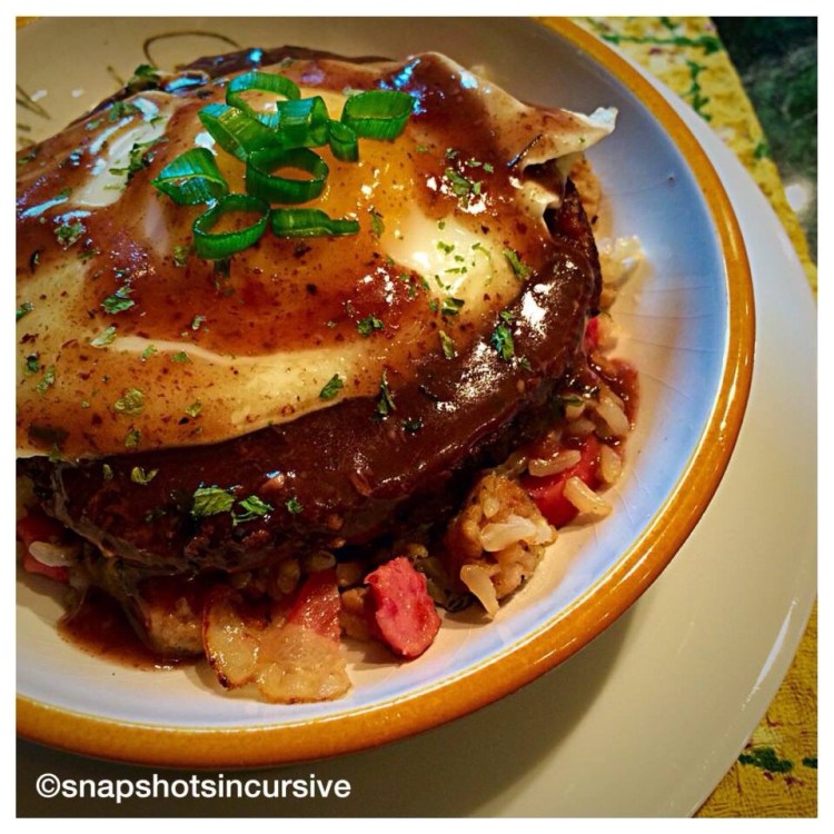 What’s Cooking in Gail’s Kitchen? Home Cooking: Loco Moco! Living up to its name, this breakfast food is actually one of Hawaii’s local favorites. The serving size is so generous you might think it’s way too much for breakfast. I didn’t eat the rest of the day after trying it at a local restaurant there. However, when you prepare it at home, you have more control over serving sizes as well as the time of day for this meal. Basically, it is composed of four layers. The bottom is fried rice, the middle is a beef patty, the next is an egg over easy. And the top layer is a ladle of gravy. Don’t knock it till you try it!