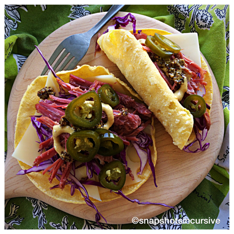 What’s Cooking in Gail’s Kitchen? Take a Seat at the Table: Reuben Tacos! Here you go…a Mexican taco with an Irish twist! Anyone who is crazy about tacos will tell you the combinations are endless. Not long after St. Patrick’s Day, there were leftovers of corned beef brisket and a wedge of purple cabbage in the fridge. My husband had gone out for lunch with the guys and I thought, “Hmmm, what can I throw together for a scrumptious mid-day meal?” It seemed like a no-brainer. Corn tortillas, Swiss cheese, pickled jalapeño slices, and Dijon mustard sealed the deal. Try it. One bite and you’ll shout, “Olé! Me Irish eyes ere smilin'”.