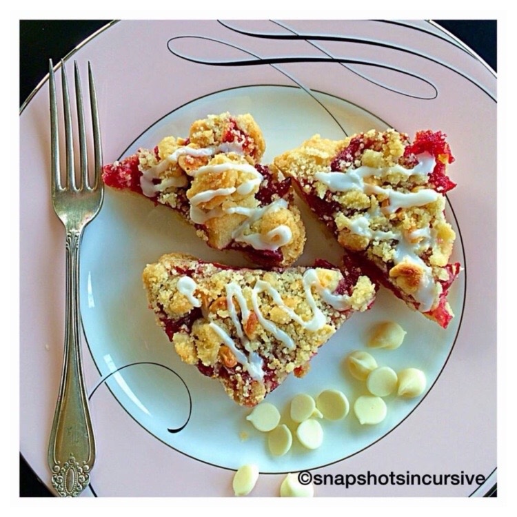 Eating My Way Through the Holidays! Sweet Celebrations: White Chocolate Cranberry Spice Bars! Like snowdrops over a country field, the white chocolate bits add a sweet creaminess to the crumb bars offsetting the tart tangy taste of cranberry sauce. You may notice a warm sweet-heat every once in awhile. It’s the candied baby ginger infused throughout. I use all-natural crystallized ginger slices and chop them up for added zing. For the merriest of holidays, make a batch of these bite-sized guilty pleasures. Perfect for a cookie exchange.