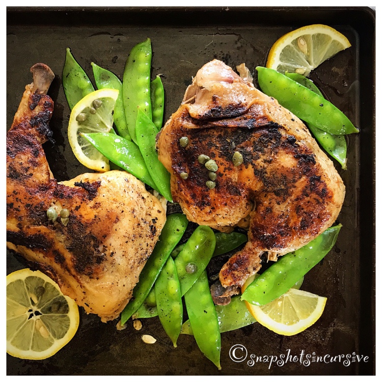 Place chicken in a slow-cooker. Combine melted butter, vinegar, orange juice, kosher salt, oregano, and garlic powder. Pour over meat. Cover. If meat is frozen, set timer for four hours on High, then four hours on Low. If meat is thawed, set timer for eight hours on Low. When finished, using a tongs, transfer chicken to a platter. Reserve marinade. To “flash fry”, warm an iron skillet with 1 tablespoon of vegetable oil on medium heat. Add chicken. Do not overcrowd. Ladle a small portion of marinade juice over chicken. It will sizzle, so a screen lid is recommended. After 2-3 minutes gently turn juicy chicken to char the other side. Add oil to prevent meat from sticking. Repeat until all chicken is fried. This works well with boneless or shredded meat. Serve warm with assorted vegetables. Garnish with capers and lemon slices.