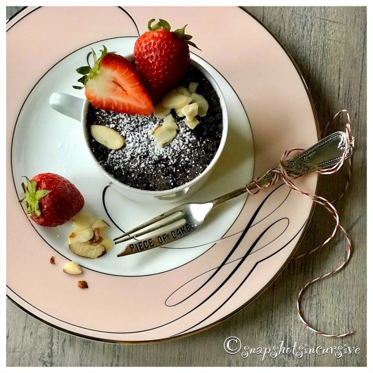 What’s Cooking in Gail’s Kitchen? Talking Points: Dark Chocolate Mug Cake! The first thing I want to tell you about this recipe is coconut flour can make a cake drier than all-purpose flour. True, it does make it a gluten-free alternative AND an excuse to add a scoop of ice cream, which I did. I would call the texture very dense, but my husband was painfully honest and used the word “dry”. I believe adding an extra egg white might alleviate that problem, but who knows? Perhaps you’ll try it and get back to me. The gist of the story is, when you’re really craving something sweet and don’t want to put a lot of time into it, this is a “piece of cake”. Two minutes in the microwave and you’ve got it. Just add fresh strawberries, sliced almonds, and a wicked scoop of vanilla bean ice cream. You can blame me.