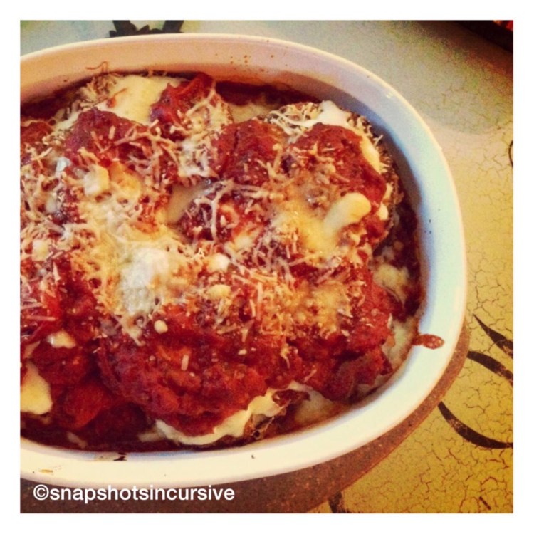 What’s Cooking in Gail’s Kitchen? Eggplant Parmesan! This incredible dish is the perfect substitute for lasagna. It is hearty and filling without all the pasta. If you’ve never cooked with eggplant before, pay attention to a little hint. This healthy vegetable can absorb moisture and oil like a sponge, so it requires advance preparation before baking. Slice the raw eggplant (skin on), place on several layers of paper towels, and salt it. The salt will draw moisture out. This takes about 2 hours. First problem solved. The second, instead of frying it in oil, bake the slices in a single layer before assembling into a casserole.