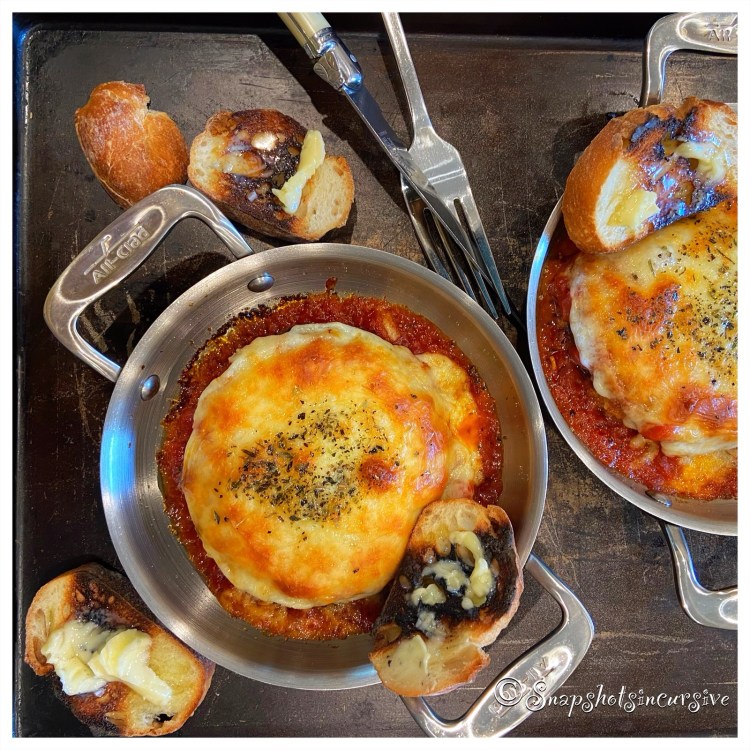 While eggplant is “resting”, make the sauce. Heat 1 tbsp. olive oil on medium heat. Add the minced garlic and gently cook for 1 minute until fragrant. Add the tomatoes and their juices, sugar, marjoram, and oregano. Increase heat to simmer for 15 minutes, uncovered. Add the minced basil and remove from heat.