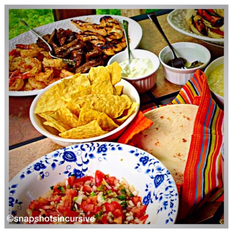 What’s Cooking in Gail’s Kitchen? Home Cooking: First-Class Fajitas! Grilling is always in season and what better way to prepare a smorgasbord of flavor. I prefer shrimp, my husband prefers steak, and we both like chicken. So we blend it all together and make this fabulous main course. Throw in the sides, salsa, and cheese, and everyone is happy!
