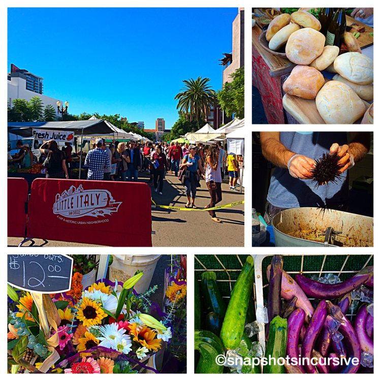 Dining Outside the Home: Little Italy Mercato Farmers’ Market San Diego, California! Three city blocks were filled with artisans and tent vendors. California growers sold bushels of farm fresh produce while gourmet chefs filled platters of specialty foods offer tempting samples for patrons walking by. Wide selections of fresh cut flowers and seasonal arrangements brightened up street corners. From European linens and handmade soaps to sushi-filled sea urchins and artisan breads, the weekly Little Italy Mercato Farmers’ Market is well worth the walk.