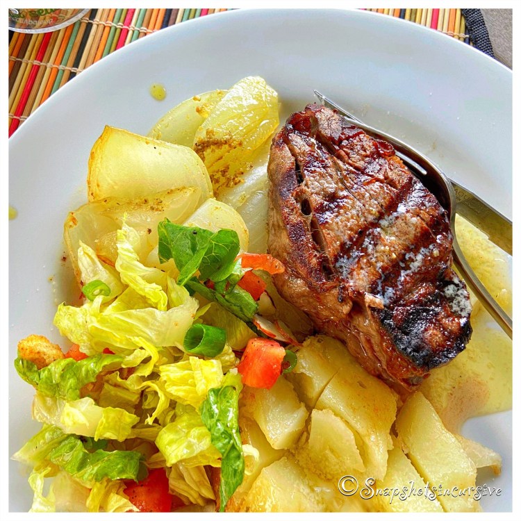 What’s Cooking in Gail’s Kitchen? Uplifting Aromas: Quintessential Steak and Asparagus! The next time you want to prepare a romantic dinner for two, nix the tossed salad and go for a terrific steak dinner served on a bed of grilled asparagus. I mean, just look at that gorgeous grassy green color! You can almost taste the smoky crunch of the charred asparagus before sinking your teeth into the luscious buttery goodness of the filet mignon. The toasted saltiness of the crispy fried onions may create a magical finish that could lead to an increased libido for later on. Hey, I’m a hopeful romantic.