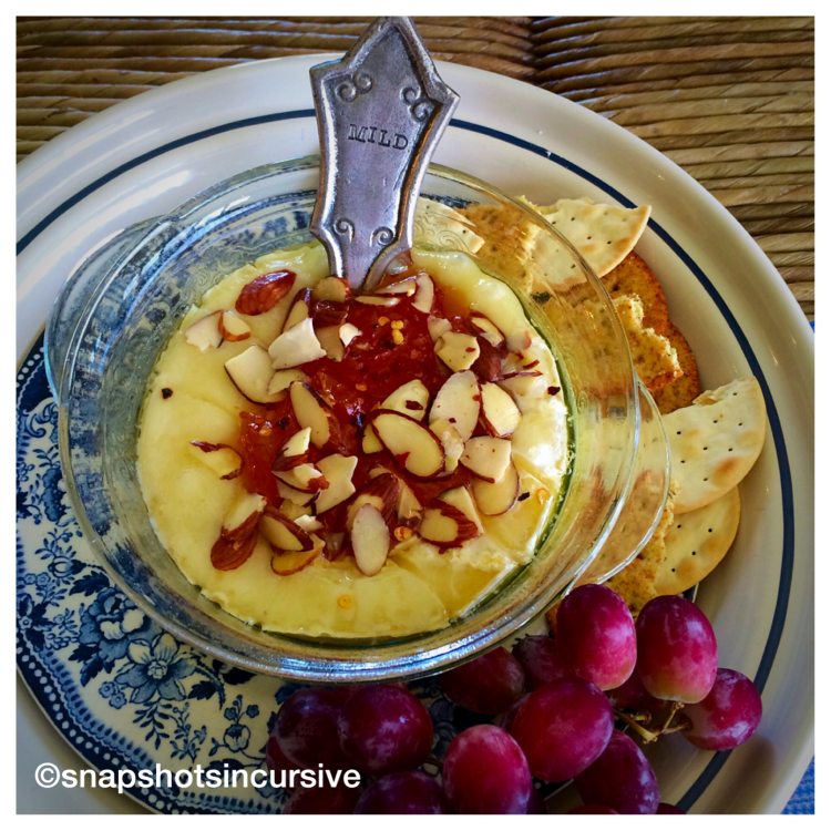 What’s Cooking in Gail’s Kitchen? Simple Sensations: Baked Brie!  I typically serve this as an appetizer, with French preserves and almonds on top, but it also makes a wonderful dessert with a light fruity wine.