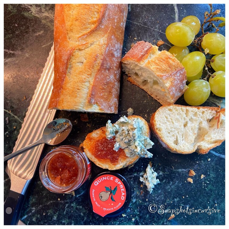 What’s Cooking in Gail’s Kitchen? A Symphony of Flavors: Quince Essential Baguette! On your recent trip to the supermarket, you may have wondered about that hard yellow fruit in the produce department that resembles a cross between an apple and a pear. Before you buy one and take it home to eat it raw, think again. Quince is one of those fruits that smells citrusy and fresh, but the flesh is actually quite stringy. You’re better off making jam, jelly, or preserves instead. Cooking transforms them into a softer and sweeter treat worth raving about. I took the shortcut and bought a jar of quince spread instead.