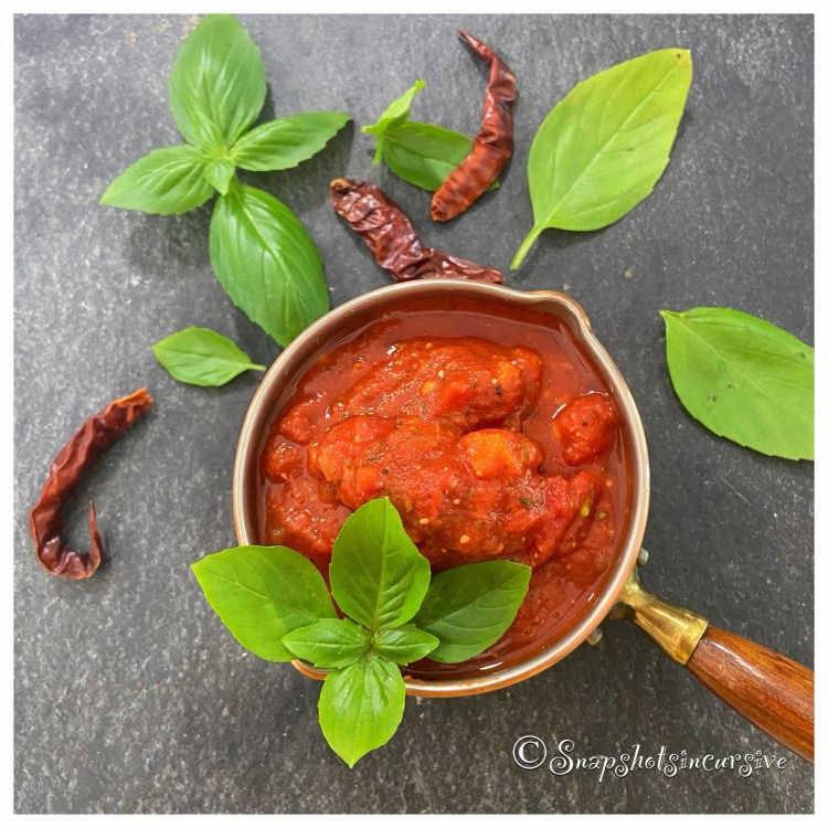 What’s Cooking in Gail’s Kitchen? Food Plating: Robust Tomato Sauce! Tomatoes are my superfood. Slow-cooked tomatoes are my staple. Honestly, I can justify making tomato sauce all day long to anyone who would listen. What it “simmers” down to is a savory, garlicky, fragrance that fills the house with anticipation of what comes next. Call me a cheater, which I won’t deny, because I am a snob about beginning with San Marzano plum tomatoes grown in Italy. My eighth grade home economics teacher taught me to keep things simple. She said, “High quality ingredients can make an ordinary dish taste extraordinary. Always read the label!” To this day, I check the ingredient list because too often the additives can be artificial. And nobody wants that.