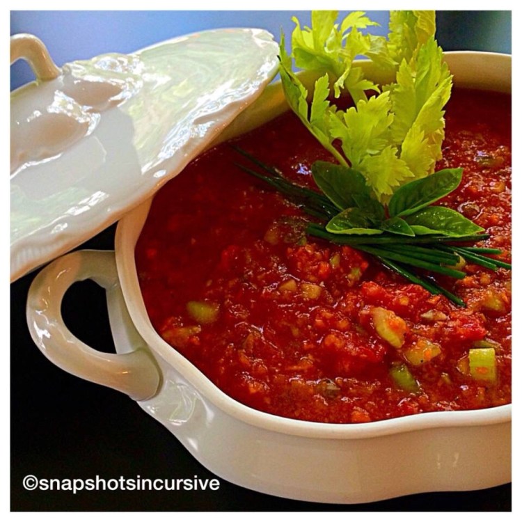 What’s Cooking in Gail’s Kitchen? A Burst of Flavor: Giddyup Gazpacho!  Yee-haw!  Get set to gather the bounty of your garden because this dish has quite a variety of appetizing vegetables! You’ll experience an explosion of flavor in every mouthful. Gazpacho is one of those mysterious soups that is meant to be eaten COLD. Sound bizarre? I know, right!  Trust me, the fusion of wholesome produce is unsurpassed. And the temperature is perfectly refreshing this time of year.