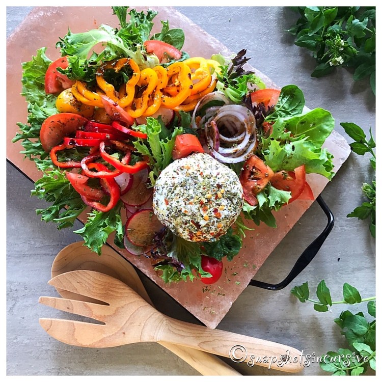 On a sheet of waxed paper, sprinkle Italian dry mix spice blend and red pepper flakes. Form the goat’s milk cheese into a ball. Roll it in the spice mix to cover all sides. Place cheese ball on the chilled Himalayan salt block. Next, arrange mixed greens in a single layer. Arrange Roma tomatoes, mini sweet peppers, radish slices, and red onion rings. Sprinkle Herbes de Provence over top. Drizzle balsamic reduction sauce over salad. Serve with crusty artisan bread.