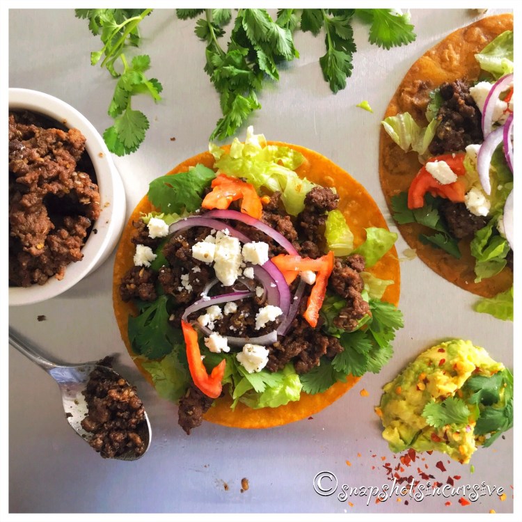 What’s Cooking in Gail’s Kitchen? Waste Not, Want Not: Grass-Fed Beef Tostadas! If you like the taste of corn tacos, the tostada is a distant cousin. Basically, one is folded, the other is flat. Brushed with oil, then “toasted” crisp, the tostada is made to hold the toppings. This recipe allows you to bend the tortilla if you prefer to eat it that way. Whatever falls onto the plate can be scooped back up into your mouth. No judgment here. Now, about grass-fed beef. It’s going to cost a little more per pound due to the lack of fat content, compounded by the extra time it takes to fatten the cow. Grain makes cows get fat faster, just like it does for humans. I like grass-fed because it is more nutritious with heart-healthy omega 3s plus vitamins. It’s all about the choices we make.