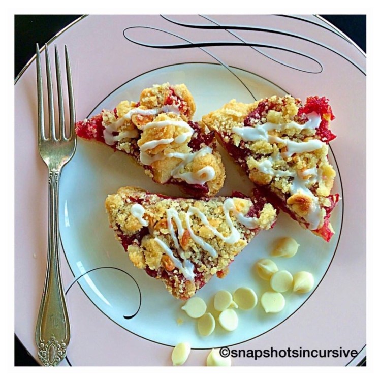 Eating My Way Through the Holidays! Special Edition: White Chocolate Cranberry Spice Bars! Like snowdrops over a country field, the white chocolate bits add a sweet creaminess to the crumb bars offsetting the tart tangy taste of cranberry sauce. You may notice a warm sweet-heat every once in awhile. It’s the candied baby ginger infused throughout. I use all-natural crystallized ginger slices and chop them up for added zing. For the merriest of holidays, make a batch of these bite-sized guilty pleasures. Perfect for a cookie exchange.