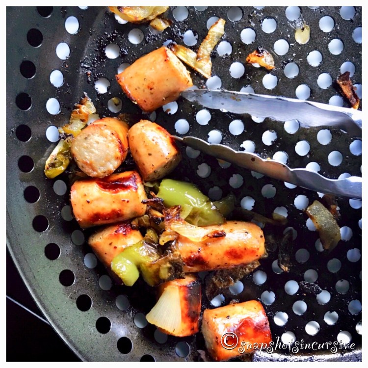What’s Cooking in Gail’s Kitchen? Enjoyable Eats: Grilled Brats, Onions, and Peppers! As you can see I was so busy sneaking one more meal of grilling outdoors before the weather changes that I almost forgot to take a snapshot. Here’s what’s left of a one-pan supper that is super-easy. Garden green peppers and sweet onions definitely complement the different spices that make up bratwurst. The reason the sausage links are cut up is because my husband and I wanted more of the “stuff” and less of the bun. Problem solved. Go bunless.