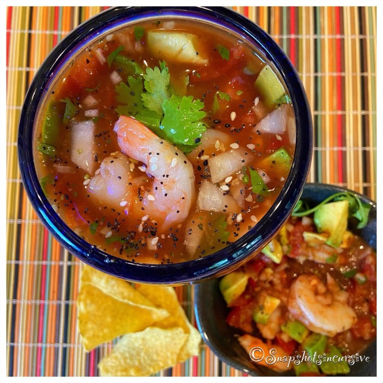 What’s Cooking in Gail’s Kitchen? Stir. Spread. Flip. Repeat: Coctel de Camerones! Two of my favorite foodstuff cravings time after time lead me to cocktail shrimp and Mexican cuisine. A friend shared his secret recipe, adding clam juice, to enhance the liveliness this dish creates for the taste buds. For now, I put it on pause to use at a later time. The spicy Bloody Mary concoction is bold beyond measure. It is also all-natural, gluten free, and contains no high fructose corn syrup. Treat yourself to the real thing.
