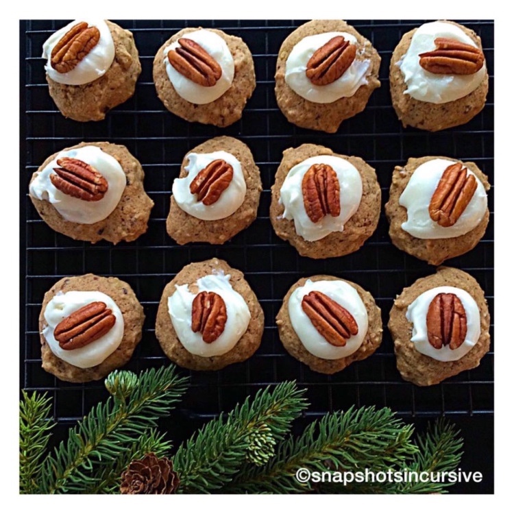 Preheat oven to 375°. Cream together butter and brown sugar until fluffy. Beat in cinnamon, nutmeg, salt, baking soda, and baking powder. Add eggs and mincemeat. Gradually stir in the flour. Fold in chopped pecans. Drop by spoonfuls onto a parchment lined baking sheet. Bake 8-10 minutes until tops of cookies are dry and set. Bottoms will be slightly golden. Remove from oven. Transfer to a wired rack. Frost while slightly warm. Top each cookie with a pecan half before frosting sets.