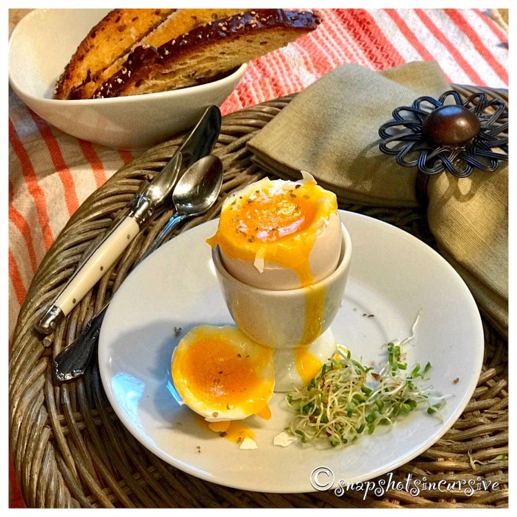What’s Cooking in Gail’s Kitchen? Clean Eating: Yolk-Stream Morning Eggs! I’m always in a good mood when I make these soft-boiled eggs for breakfast. Perhaps it’s because I get to dip crunchy, buttery strips of toast into the yolk and watch it run over the edge of the cup. I imagine the toast as soldiers on parade, each awaiting their turn to be dunked. Or maybe it’s because slurping the fatty center of the egg makes me feel naughty and I’m completely aware I’m getting away with it. In any event, playing with my food this way is absolutely satisfying.