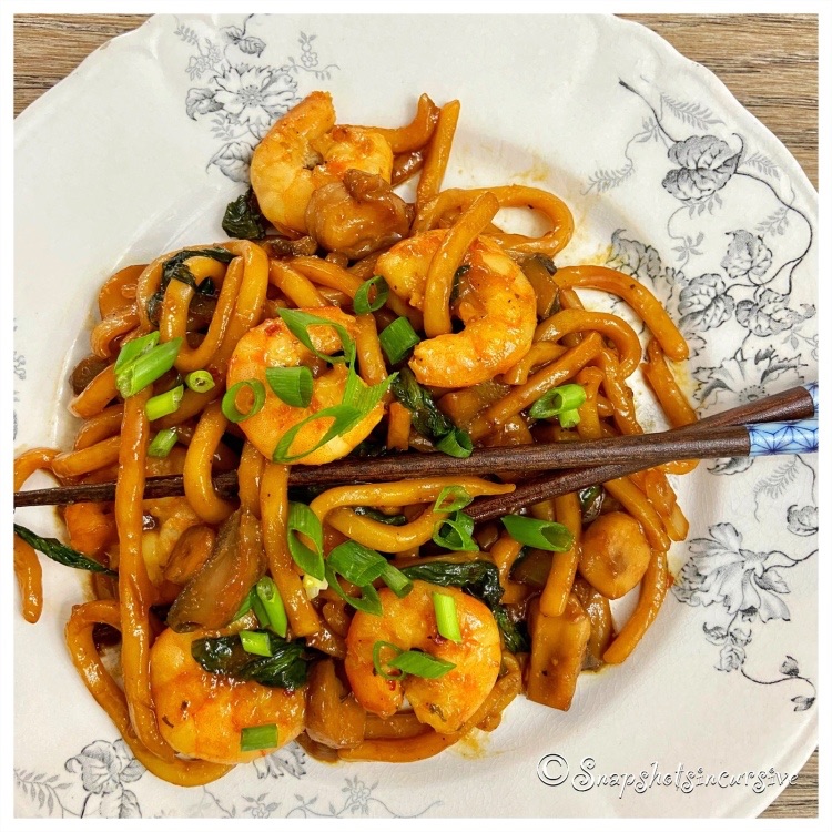 What’s Cooking in Gail’s Kitchen? Graze or Gobble: Udon Noodles with Shrimp! Everyone goes crazy over noodles. Udon noodles, made popular by the Japanese culture, offer the chewy thick texture associated with comfort food. Basically made from flour, salt, and water, they can take on the flavor of whatever ingredient you add to it. Being a shrimp-lover and mushroom fanatic, the choices here were not even up for debate. My kitchen, my choice. But I can tell you this, the sauce alone is slurp-worthy.