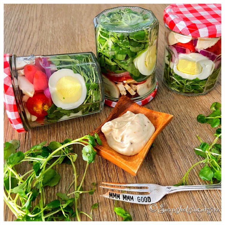 What’s Cooking in Gail’s Kitchen? Palatable Possibilities: Watercress Spinach Salad in a Jar! My heart beats a little faster whenever I come across a bunch of watercress at the fresh marketplace. I know immediately that I will pair it with baby spinach because they work well together. Its slightly peppery taste is an amazing balance to the mild sweetness of spinach leaves. By portioning salads in a jar, they keep a couple days in the refrigerator, as long as the dressing is added later, when served. Not only is the salad appealing, it comes across as pure genius. Mmm Mmm Good.