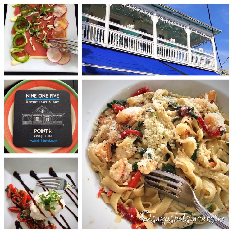 Dining Outside the Home: Nine One Five in Key West, Florida. During the day you may walk by this charming whitewashed Victorian home, with ocean blue accents, thinking it’s a magnificent private residence. What a glorious sight. However once the evening hours roll around, every table seems to be filled with jovial guests on the wrap-around veranda before overflowing into the front yard beyond the white picket fence. Notice how the amber lights soften the mood for intimacy and celebration. Your first thought may be, “How do I get invited to the party?” My advice? Make a reservation because if you don’t, you’ll wish you did. Take time to enjoy every course. For starters, think about the raw Ahi Tuna Gravlax or fig balsamic Burrata. Delectable choices. Homemade pastas like fettuccine, cannot be resisted, especially when mixed with Key West pink shrimp and capers. The menu is varied to appeal to every palate. Go ahead, you’re worth it.