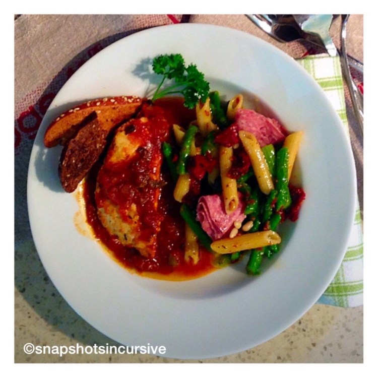 Combine penne pasta, asparagus pieces, diced sun-dried tomatoes, and salami rounds. Pour olive oil dressing over all. Gently mix. Add pine nuts. Garnish with fresh parsley sprig. Serve warm with garlic toast. This is an excellent side dish to Chicken Cacciatore.