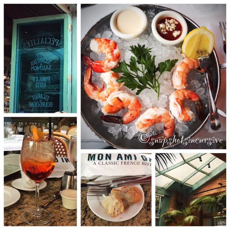 Dining Outside the Home: Mon Ami Gabi in Las Vegas, Nevada! An afternoon shower can provide a welcome respite from constant motion along the Las Vegas Strip. Slip through the French turquoise doors of Mon Ami Gabi at Paris for a sip of this and a nibble of that. Might I suggest an unpretentious Aperol Spritz to accompany the “Fruit de Mer” succulent Shrimp Cocktail platter. The magnificent essence of orange moscato is aromatic with citrus notes, which makes it perfect for any afternoon.